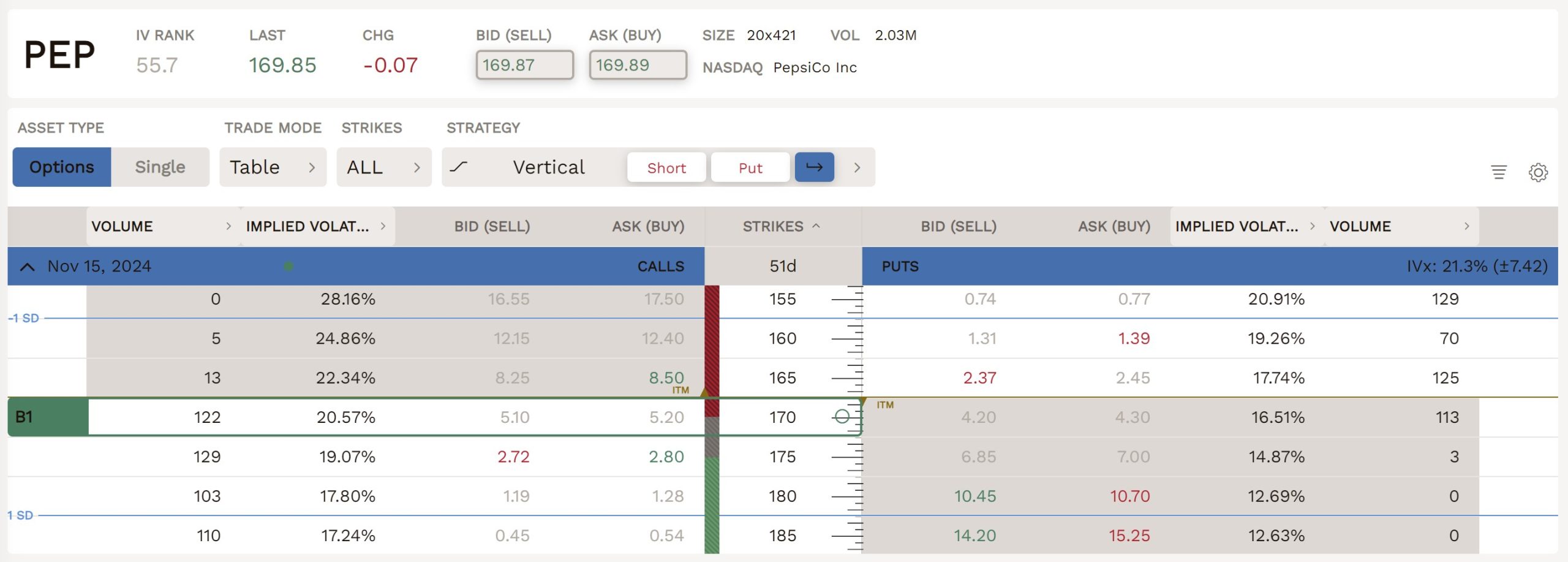 For example, in the example below we can see that the PEP $170 Calls have a bid of $5.10 and an ask of $5.20. That's a .10 difference on a $5.20 mid-price option, giving us under a 2% spread (.10/5.20 = 1.9%.). That's a great options market to trade.