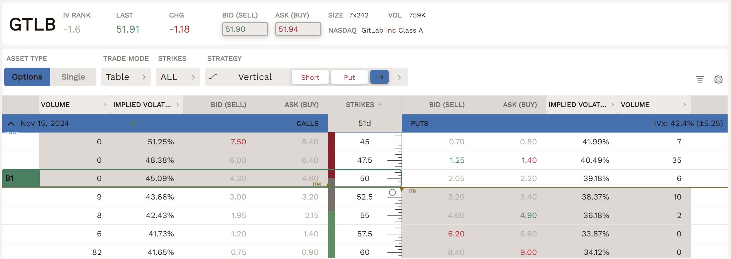 On the other side of the coin, let's look at GTLB. Here we can see the bid/ask spread is 4.30/4.60. This gives us a spread percentage of ((4.60-4.30)/4.45) 9%, which is far too large for trading. The cost of a large spread goes straight to your bottom line.