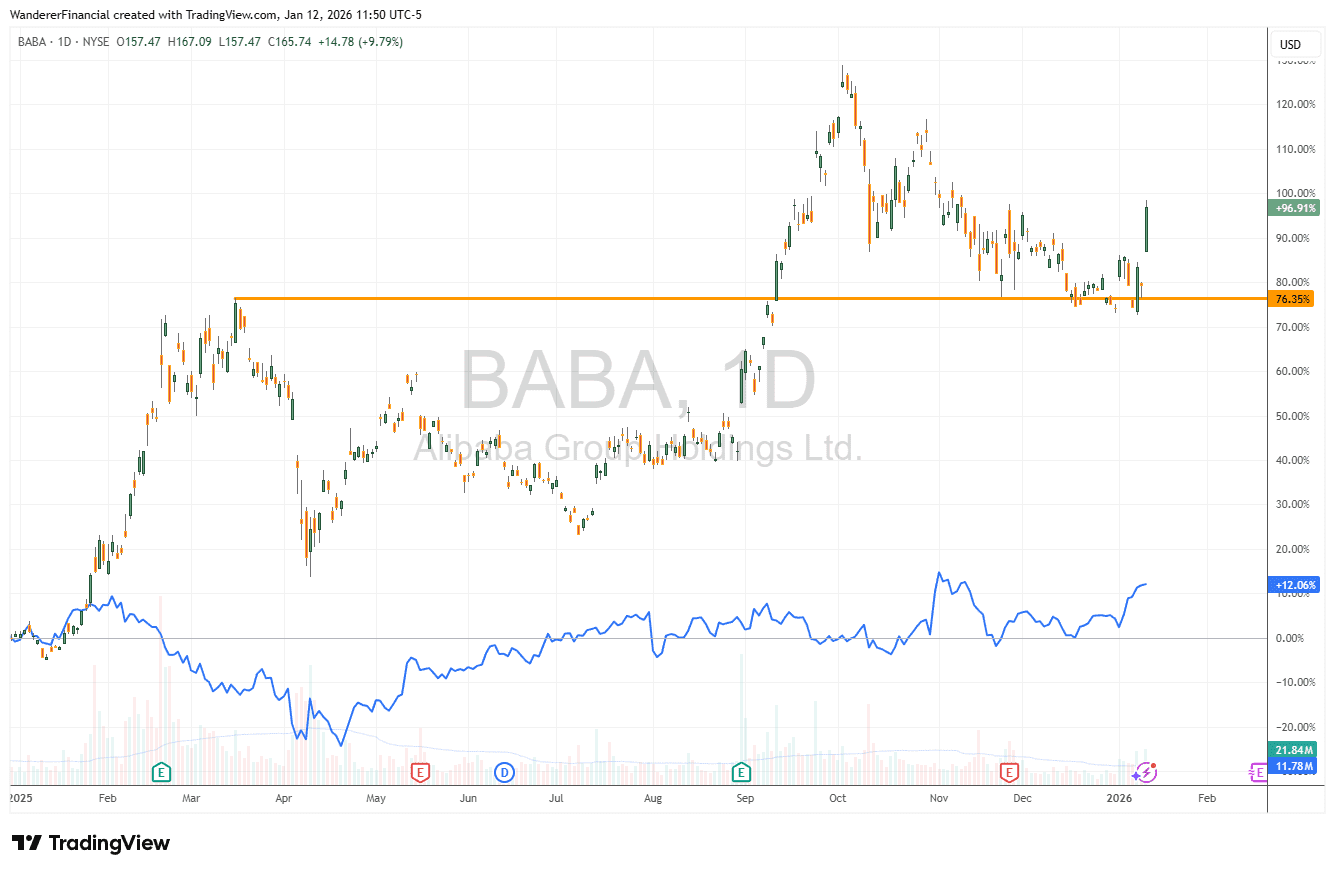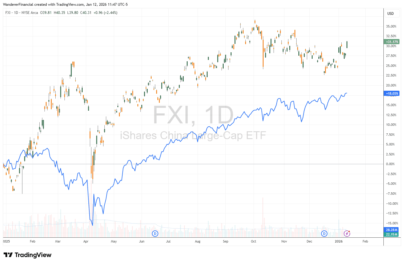 A "theme" of our investing at Wanderer since the beginning of 2025 has been that Chinese stocks are undervalued relative to their American peers. This has been a strong performer, with the FXI China Large-Cap ETF outperforming the S&P ~31% to ~18% since then (see chart below with S&P in blue).