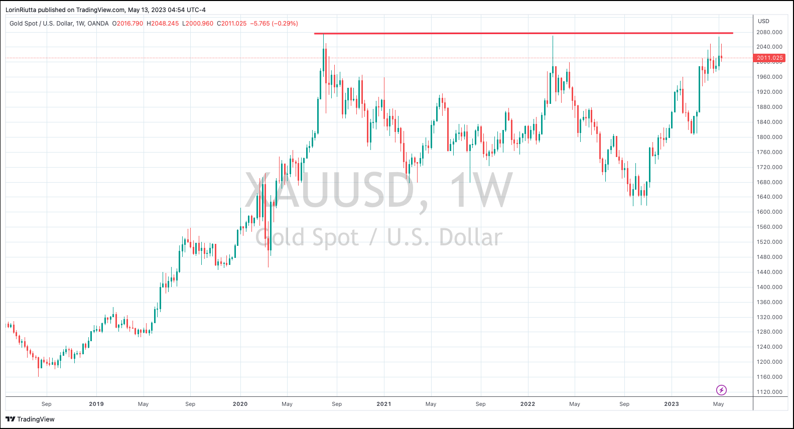 Now that we’ve made the fundamental case for owning gold, let’s look at the current technical side of it to see if it represents a good trading opportunity. Looking at a weekly chart, we see gold rose and fell a little before finishing the week very close to where it started. From a trading perspective, the reward-to-risk ratio heavily favors risk. The price is just beneath major resistance and could pull back and consolidate before making it through.